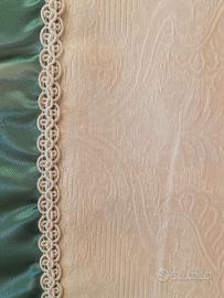 elegante copriletto matrimoniale in cotone con passamaneria e nastro di raso verde , completo di lenzuolo di sotto sopra e due federe..