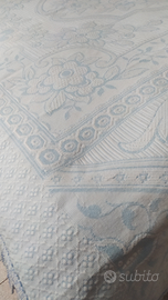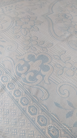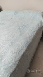 Vendo copriletto matrimoniale vintage colore azzurro con frange su tre lati.