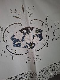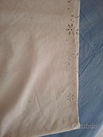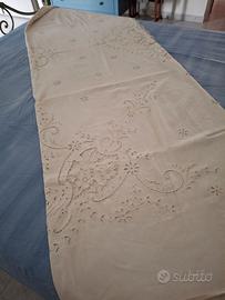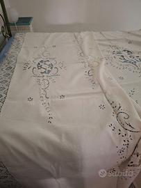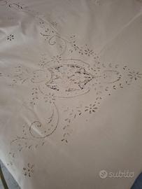 Antico copriletto in pesante misto lino, mai usato e proveniente da dote matrimoniale conservata in cassapanca di legno, avvolto in carta. Non danneggiato da lavaggi o stirature improprie. Esente da muffe, pochissime macchioline 'da armadio ' in una zona limitata, che ne testimoniano l'autenticità.