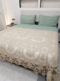 Copriletto matrimoniale ricamato a mano al tombolo, colore avorio/beige. Lavorazione artigianale con motivo floreale e bordo rifinito, molto elegante e in ottime condizioni. Perfetto per arredamento classico o shabby chic.