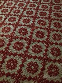 Copriletto sardo a tre teli tessuto a mano su telaio antico in legno , anni 80. Lana e cotone. Frange a macramè realizzate a mano. Grande dimensione. È completo di 3 tappeti giroletto coordinati. Mai usati. € 1000, leggermente trattabili.