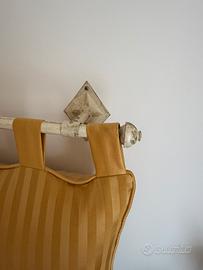 Vendo copriletto realizzato su misura dal tappezziere per letto 100x 190, ma adatto ad una piazza e mezzo ( lungo fino a terra ), 2 cuscini 38x38, sfoderabili e fatti dello stesso tessuto; testata imbottita da appendere mis.110 x 65. cm., stesso tessuto, colore giallo ocra- liscio e rigato-, più asta. Ritiro e trasporto a carico dell’acquirente. €150 tutto.