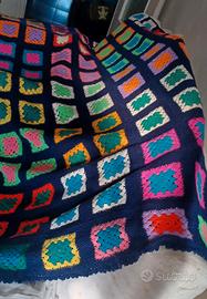 Copriletto matrimoniale in lana, fatto a mano all'uncinetto in vari colori, composto da quadrotte di 14 x 14 cm bordate in blu.