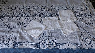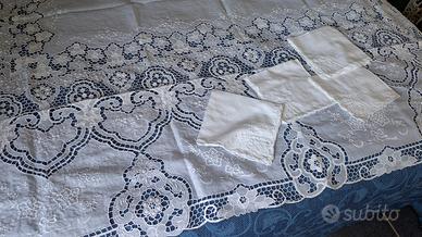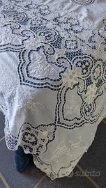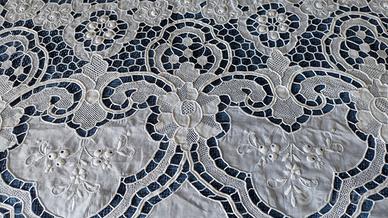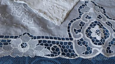 Vendo copriletto matrimoniale e set da tavola (tovaglia + 12 tovaglioli) in pregiata tela d’Olanda, mai utilizzati e ricamati interamente a mano negli anni ’90 da esperti artigiani baresi.