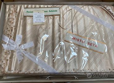 Il copriletto è di colore beige/dorato, con un motivo decorativo floreale al centro e lungo i bordi.
