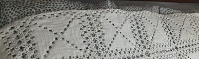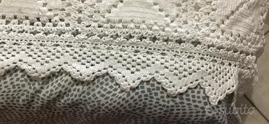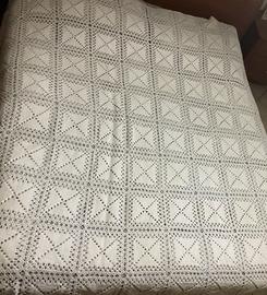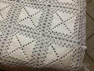 Vendo bellissimo copriletto all’uncinetto fatto a mano con lavorazione artigianale a quadrati e bordo decorativo.