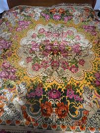 Copriletto barocco-broccato Veneziano vintage con frange, grandi dimensioni. Lavorazione italiana velluto, passamaneria in ciniglia, interno in cotone. Decorazioni angeli cherubini, fiori e frange. Colori toni caldi e decisi. Dimensioni: 240 x 220 circa Decorazione Arazzo antico in stile barocco, preziosa coperta da utilizzare anche per esposizioni. NUOVO, mai utilizzato