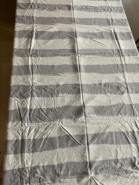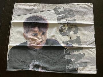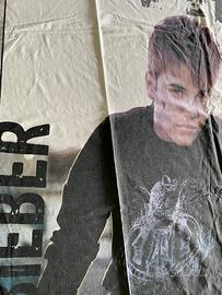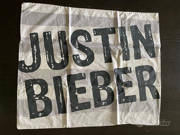 Copripiumone per letto singolo in cotone cm. 130x200 (oltre risvolta) Justin Bieber, con federa cm. 70x58. Lato A immagine del volto con chitarra e scritta; lato B a righe grigio chiaro e scuro. Normali segni di usura, ottime condizioni:vedere foto. NO etichette.
