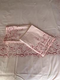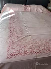 Copripiumone matrimoniale colore rosa stampa in contrasto con coppia di federe in finissimo cotone prodotto da una rinomato fabbricavdi biancheria fiorentina.Nuovo mai usato.