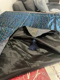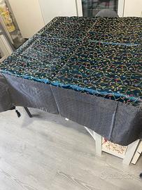 Copritavolo quadrato con nappine agli angoli colore blu/ grigio, mis 1,38x1,38.