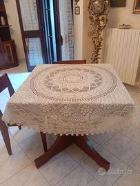 COPRITAVOLO ROTONDO IN COTONE LAVORATO AD UNCINETTO ANNI 80.