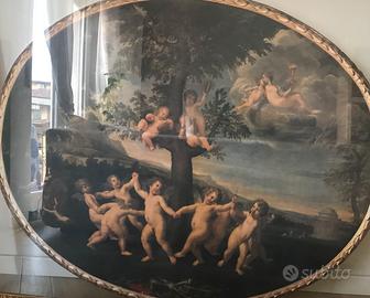 elegante cornice spagnola in foglia d'oro, misure 112x135 cm contenente una stampa rappresentante angioletti. Oltre alla sua funzione ornamentale può, con un piccolo investimento aggiuntivo, essere ripensato come uno specchio, in grado di donare eleganza e luminosità alla vostra casa
