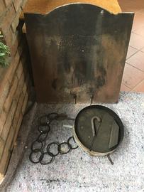 Pregevole cornice di camino realizzata in terracotta toscana incerata, con fondo liscio in ghisa e relativi strumenti di chiusura fumi più lastra libera a bassorilievo in ghisa. Misure: altezza e larghezza 112, larghezza bocca 76, profondità 12. Il manufatto si presenta in tre elementi collocati su un bancale pronto per essere caricato. Ritiro a carico dell’acquirente.