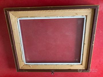 Vendo elegante cornice vuota in stile classico, ideale per valorizzare dipinti, stampe, fotografie d'autore. Condizioni buone, come da foto. Dimensioni: 54x66cm Dettagli e Materiali: Profilo esterno: Legno con finitura dorata. Passepartout: Ampio bordo interno rivestito in tessuto (tipo tela/lino) colore crù/sabbia naturale, rifinito con un sottile profilo interno bianco a contrasto. Accessori: La cornice viene venduta completa di lastra di vetro protettiva e gancetto posteriore metallico, pronta per essere appesa.