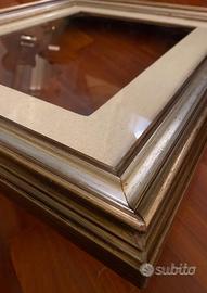 Cornice in legno colore argento e oro con passe-partout in tela per quadri 30x40. Togliendo il passe-partout può accogliere quadri fino a 40x50. Dimensioni esterne 57x48.