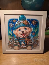 Bellissima cornice decorata con un tenero cagnolino in maglione invernale. Un tocco di luce e allegria per la tua casa.