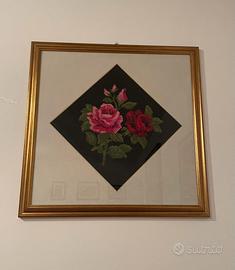 Ricamo di fiori, fatto a mano e incorniciato. Misure totali: 73 x 73 x 3,5 spessore