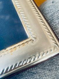 Cornice d’argento rettangolare, misure 30,5 cm per 25,5 cm. Doppio bordo lavorato a treccia.