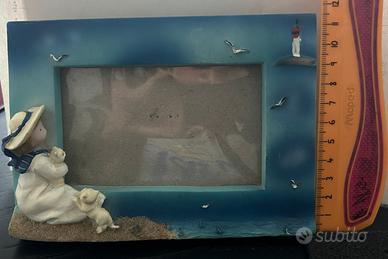 Deliziosa cornice da tavolo con decorazione a tema marino. Raffigura una bambina con due gattini seduta sulla sabbia, con un faro e gabbiani sullo sfondo.