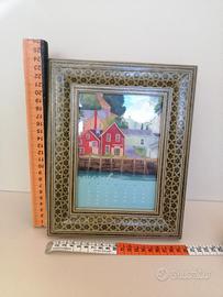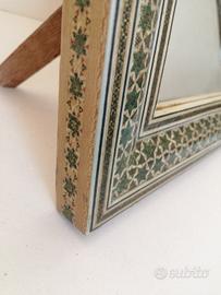 Vendo una cornice etnica in legno decorato a intarsi ,vintage, con specchio. Presenta normali segni del tempo, che ne possono conferire un aspetto di eleganza.Le condizioni generali sono buone. Insieme posso spedire un vetro, per sostituire lo specchio e fare così una cornice per foto o disegno. Le foto sono parte integrante della descrizione e contengono le misure.Le monetine e la cartolina colorata non sono compresi nell'ordine. (specchio e vetro possono avere dei leggeri graffi)