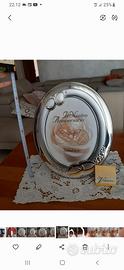 Cornice grande, ovale, in argento con dettagli in oro Valenti & C. 50^ anniversario di matrimonio, nozze d'oro con retro in legno lucido marrone. Disegnata e prodotta in Italia. Dimensioni in foto.