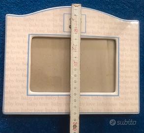 Cornice rettangolare in ceramica effetto scheggiato con piccole scritte rosa" baby love", retro nero, apertura con 2 gancetti. Misure in foto. Adatto a fotografie 10x15. Non ha scatola.