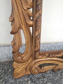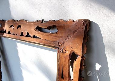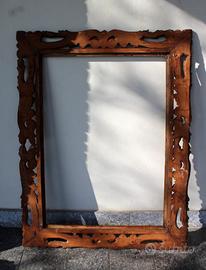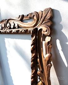 Cornice artigianale in legno - grandi dimensioni. MISURE: 71,7 x 101 cm (interne) 127 x 98 cm (esterne) MATERIALE: Legno massiccio con lavorazione d'intaglio a giorno (traforata). STILE: Barocco classico. STATO CONSERVAZIONE: La cornice è strutturalmente solida. Presenta segni del tempo coerenti con l'epoca, tra cui alcune fessurazioni naturali del legno sulle giunzioni e una mancanza di materiale su un angolo inferiore (visibile nelle foto di dettaglio). Questi elementi non pregiudicano la tenuta. Ideale per restauro conservativo o per essere utilizzata con finitura vintage. CONSEGNA: a mano