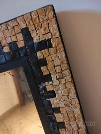 Cornice in mosaico fatta interamente a mano su telaio in ferro fatto a mano con specchio già inserito a effetto antichizzato. Le tessere del mosaico sono state tagliate a mano da blocchetti di marmo. Base in cemento. Eventualmente lo specchio è anche sostituibile perché estraibile