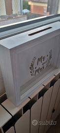 Cornice in legno chiaro, perfetto per raccogliere le buste o le offerte degli invitati al matrimonio.