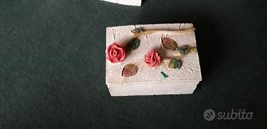 Set composto da cornice, orologio e scatoletta in impasto di argilla beige decorati con rose in rilievo. Cornice per foto, orologio da tavolo, scatoletta portaoggetti. Dimensioni: scatoletta cm 8,5 x 6,5 x 3,5 / cornice cm 20 x 16 (11,5 x 8,5) / orologio cm 10 x 9. L’orologio è a pile ed è perfettamente funzionante. Vendo anche separatamente: orologio euro 6, cornice euro 6 e scatoletta euro 3.