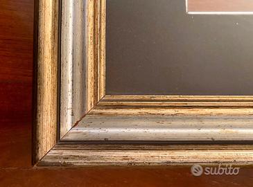 Cornice in legno colore argento e oro con passe-partout in velluto marrone per quadri 30x40. Togliendo il passe-partout può accogliere quadri fino a 40x50. Dimensioni esterne 58x48.