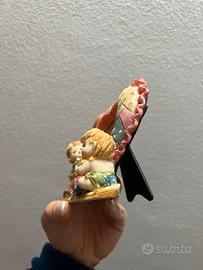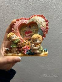 Deliziosa cornice portafoto vintage a forma di cuore, ricca di dettagli e colori pastello. La base è decorata con statuine di due bambini piccoli, un orsetto e piccoli regali, creando un'atmosfera tenera e nostalgica.
