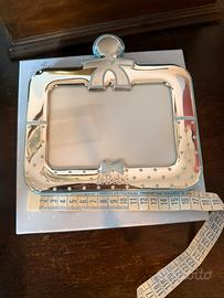 Questa è una cornice portafoto Le Bebé in argento bilaminato con sagoma di bimbo e smalto azzurro