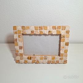Elegante cornice portafoto artigianale con mosaico di marmo travertino multicolore. Prodotta in Italia, sono io ad averla reallizzata, la cornice è nuova e può essere esposta sia da appoggio che come quadretto a muro. Dimensione della foto 10x15