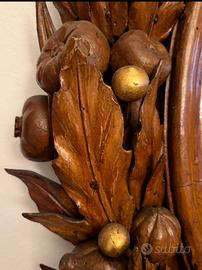 Cornice specchiera rotonda, origine centro Italia, con decorazioni di foglie, frutti e bacche di alloro intagliate a mano una per una. Un pezzo straordinario, imperdibile. Cedo per trasloco. Non spedisco. Ritiro diretto a San Benedetto del Tronto.