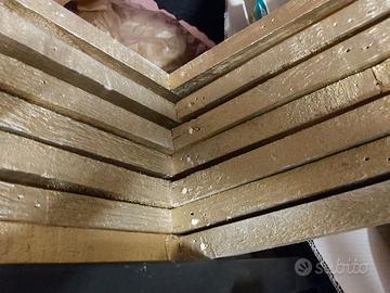 VENDO n°7 cornici con effetto tipo quadro il legno color oro, realizzate con elementi in legno spruzzati a vernice dorata, da appendere su vetrine o d'effetto; dimensioni esterne cm.105x95