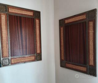 Vendo stupenda coppia di cornici etniche in metallo lavorato e legno. Le misure esterne sono L. 64 cm. H. 85 cm. Le misure interne sono L. 40 cm. H. 60 cm. No spedizione