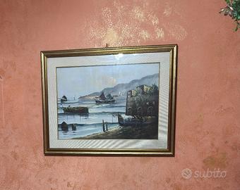 Cornici in legno in foglia d'oro complete di passe-partout in legno rivestito con tela color panna larga cm 6 per lato e spessore frontale della cornice di cm 6. Le misure interne del quadro si riferiscono interno passe-partout e sono complete di vetro a protezione dei dipinti. Le cornici sono come nuove.