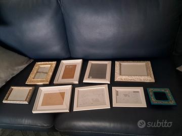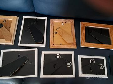 cornici portafoto in legno,varie misure 10x25 13x18 7x10, tutte tranne la più piccola si possono appendere. totale 9 pezzi