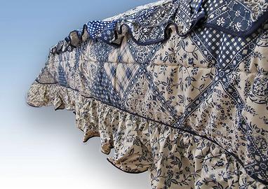 Il corredo è composto da una trapunta matrimoniale con gale applicate con due tessuti stampati con disegno provenzale, interno ovatta e lana, misure cm 270x270.