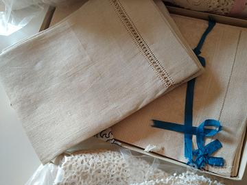 Lenzuola, asciugamani, tovaglie e tovaglioli di lino, ricamati a mano. Copriletti in cotone e in lana lavorati a mano all'uncinetto. Mai usati. Per info e prezzo scrivere in privato.