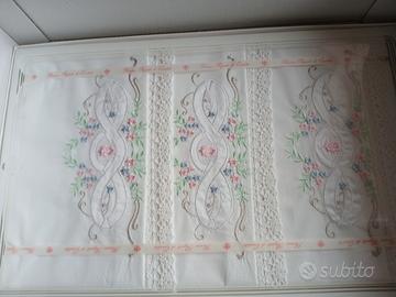 Parure in tessuto Bassetti cotone misto lino,ricamo a mano arte fiorentina, pizzo a tombolo, con certificato di garanzia, composto da tovaglia 240x280, 12 tovaglioli, 6 asciugamani, lenzuolo matrimoniale e coppia di federe. In confezione originale. Prodotta a metà anni 90.