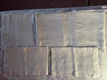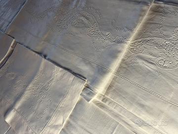 Corredo per letto matrimoniale in puro lino composto da: lenzuolo sopra e due federe con inserti al cantú ricavati a mano, con ricami e bordorina fatti a mano.