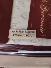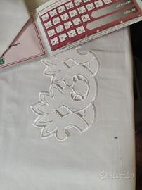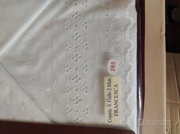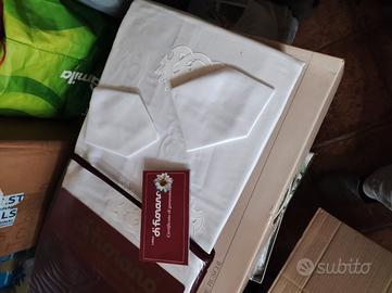 Composto da tre set di lenzuola matrimoniali (sopra sotto e federe) copriletto in puro cotone interamente ricambiato e tovaglia per 12 con tovaglioli. Nuovo, con certificato di garanzia, linea di fiorano, gruppo industriale tessile, negli imballi originali
