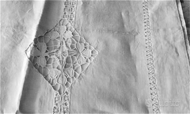 LENZUOLO inciso e ricamato a mano su un lato, con sfilature ricamate, come si vede dalle foto fatte sul fondo nero. Fatto a 3 telai con cucitura a mano invisibile. Misure in cm 289 x 234.