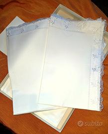 Proveniente dal baule della nonna, qualità ed eleganza di un tempo. Corredo parure letto matrimoniale, tessuto cotone 100% e sovra tessuto in organza trasparente impreziosito da ricamo svizzero (Suisse) sangallo, misure 240 x 290, colore bianco. Composto da lenzuolo sotto (senza angoli elasticizzati), lenzuolo sopra, 2 federe. In confezione originale, mai usato, condizioni perfette. Fine e raffinato, si inserisce bene anche in arredi classico, retrò, shabby chic, per la casa o strutture ricettive o come letto di nozze. Misure confezione 56 x 36, ritiro diretto zona Roma est o spedizione. 80 Euro