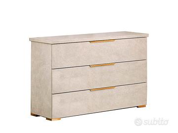 Comodini e comò coordinati: la cassettiera e i comodini si integrano perfettamente con il design del letto, presentando linee pulite, finitura crema e maniglie/dettagli dorati che ne esaltano l’estetica.