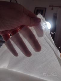 Due tagli di cotone egiziano bianco per lenzuola alberghiere. Trama molto fitta, potrebbe essere cotone Percalle ma non ne sono sicura, uno di 10 metri, l'altro di 3 metri, entrambi alti 2,40 metri, con cimosa ai bordi che non necessita di orlo, corrispondenti a realizzare almeno due paia di lenzuola matrimoniali (due sopra e due sotto) e quattro federe da cm 50×80. Vendo insieme.