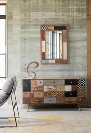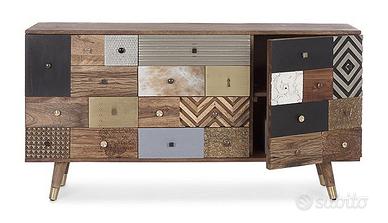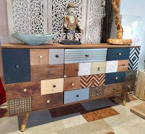 Struttura in legno di mango, schienale in mdf. Frontale ante in legno riciclato mango ed acacia, struttura cassetti in mango ed acacia. Finitura con vernice a base d'acqua. Maniglie in acciaio. Listino ? 1.342,00 offerta ?980,00 Misure: 150a x 40b x 78h