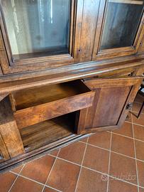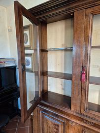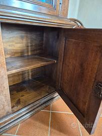 credenza vintage in legno vetro con 3 ante in vetro, con serratura e chiavi, ogni anta con 3 ripiani, perfetta per libri e non solo, con 3 porticine nella parte bassa ognura chiudibile con chiave con 2 ripiani ognuna e quella centrale con cassetto segreto No muffa o umidità NO Spedizione, ritiro a carico acquirente presso Moriondo Torinese